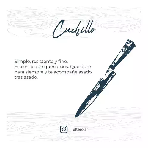 Cuchillo de madera trenzado con cuero Negro. Viene con vaina Marrón o Negra a elección. Hoja de acero inoxidable de 15cm, marca El Tero. El cabo es redondo y esta trabajado a mano, tiene un largo de 9cm.