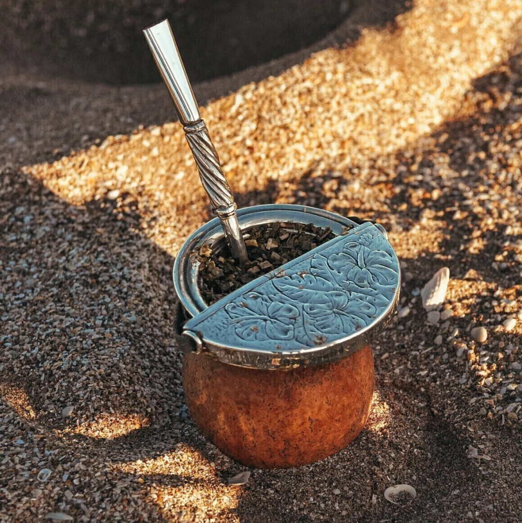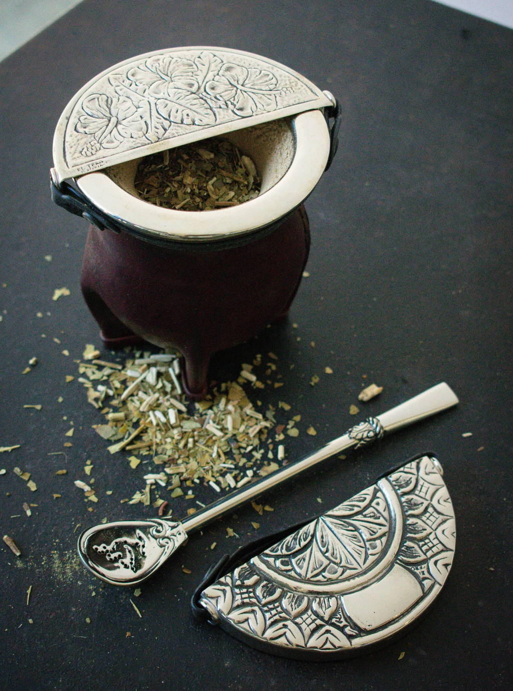 Media tapa para el mate. Realizada en alpaca, con una banda elástica para engancharlo al mate y evitar que se vuele la yerba seca. Ofrecemos dos tamaños: 11cm o 10cm.